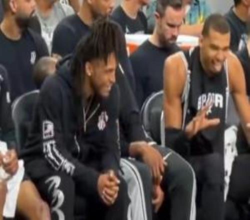嘛呢班子文班昨日替補席和卡斯爾玩鬧搞怪模仿小狗吐舌