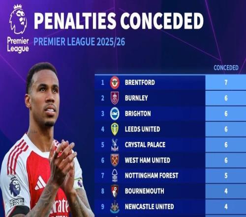 本賽季英超點(diǎn)球丟球榜:布倫特福德7球第1,阿森納0球